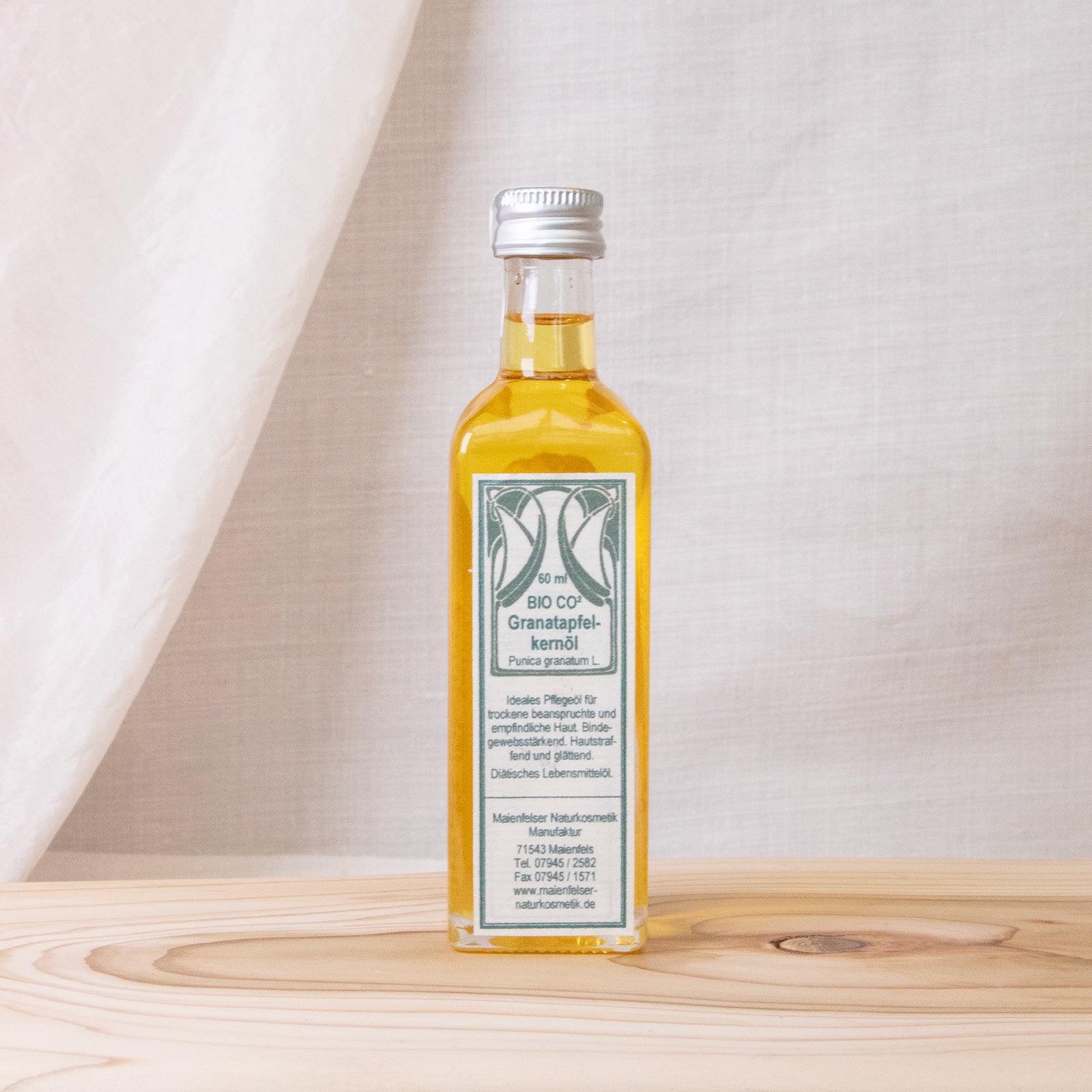 Der Granatapfelbaum kommt ursprünglich vor allem im südwestlichen Asien von der Türkei über den Iran, Syrien bis nach Indien vor. Heute sieht man ihn auch rund ums Mittelmeer. Die rote Frucht des Granatapfels beinhaltet zahlreiche erbsengrosse Samen mit roter Aussenschicht, die entweder kaltgepresst oder in CO2-Extraktion ein sehr wertvolles Öl ergeben. Das hellgelbe Öl hat einen lieblichen, leicht süßen Duft. Durch den hohen Anteil einer ungewöhnlich seltenen Ölsäure - der Pumicinsäure, die zu den mehrfach ungesättigten Fettsäuren (Omega 5) gezählt wird - zeigt das Granatapfelkernöl eine starke antioxidative Eigenschaft.