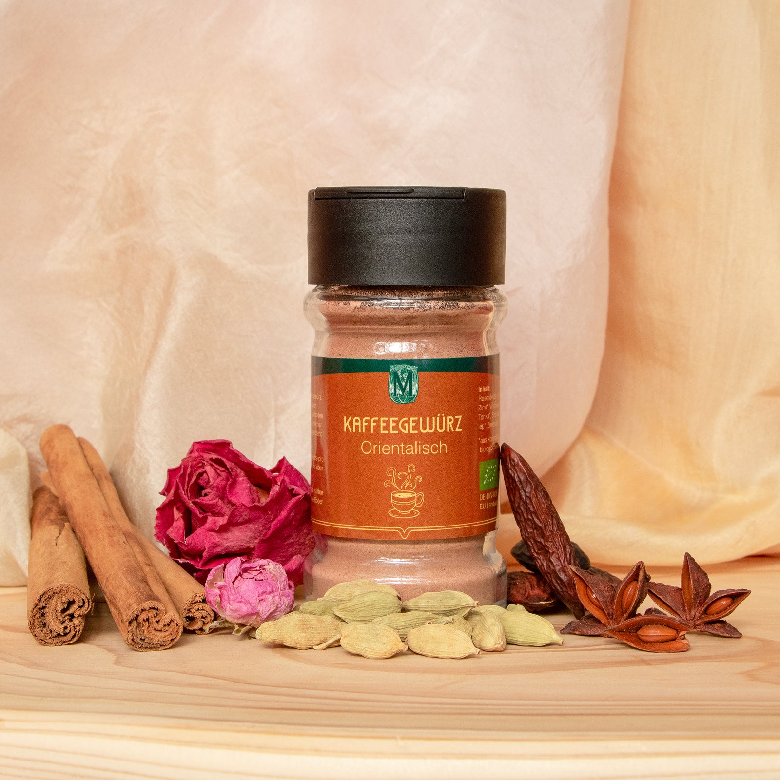 Schon seit der Antike werden Gewürze dem Kaffee beigegeben, um sein Aroma zu verfeinern und ihn bekömmlicher zu machen. Die warme, leicht würzige Mischung verleiht dem Kaffee eine sanfte Tiefe und einen feinen, orientalischen Duft.