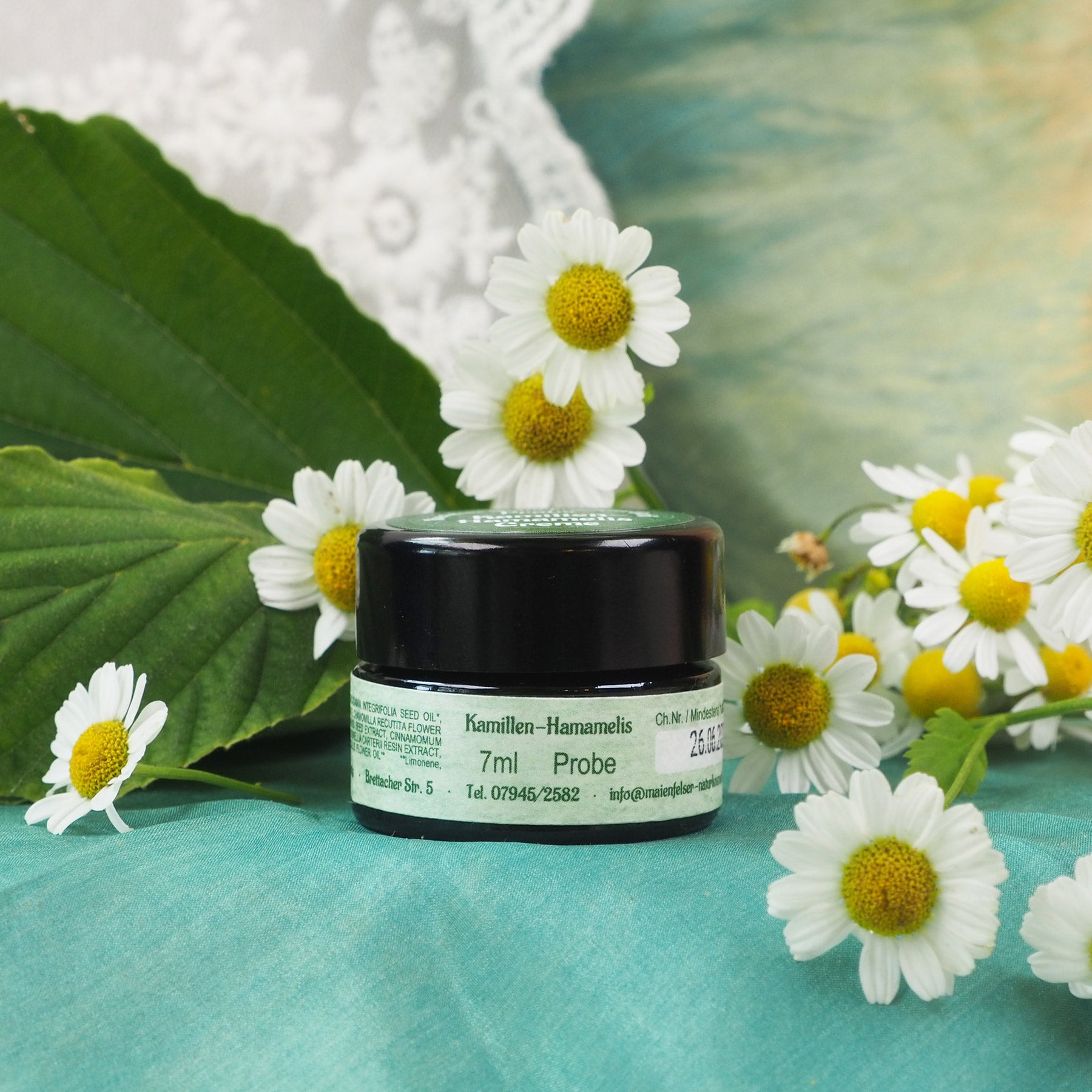 Dies geht von einem wässrigen Teeauszug über den alkoholischen weiter zur Mazeration in fettem Öl und der Wasserdampfdestillation der Blüten. Hier kommen noch die verschiedenen Kamillenarten zum Einsatz. Die tiefblaue ätherische Essenz ergibt mit den gelben Ölen einen schönen leichten Grünton. Die Hamamelisblätter (Zaubernussstrauch) sind schon seit dem Altenturm bekannt für ihre hautpflegende Wirkung und die restlichen Naturzutaten tun ihr Übriges. Ohne Glycerin.