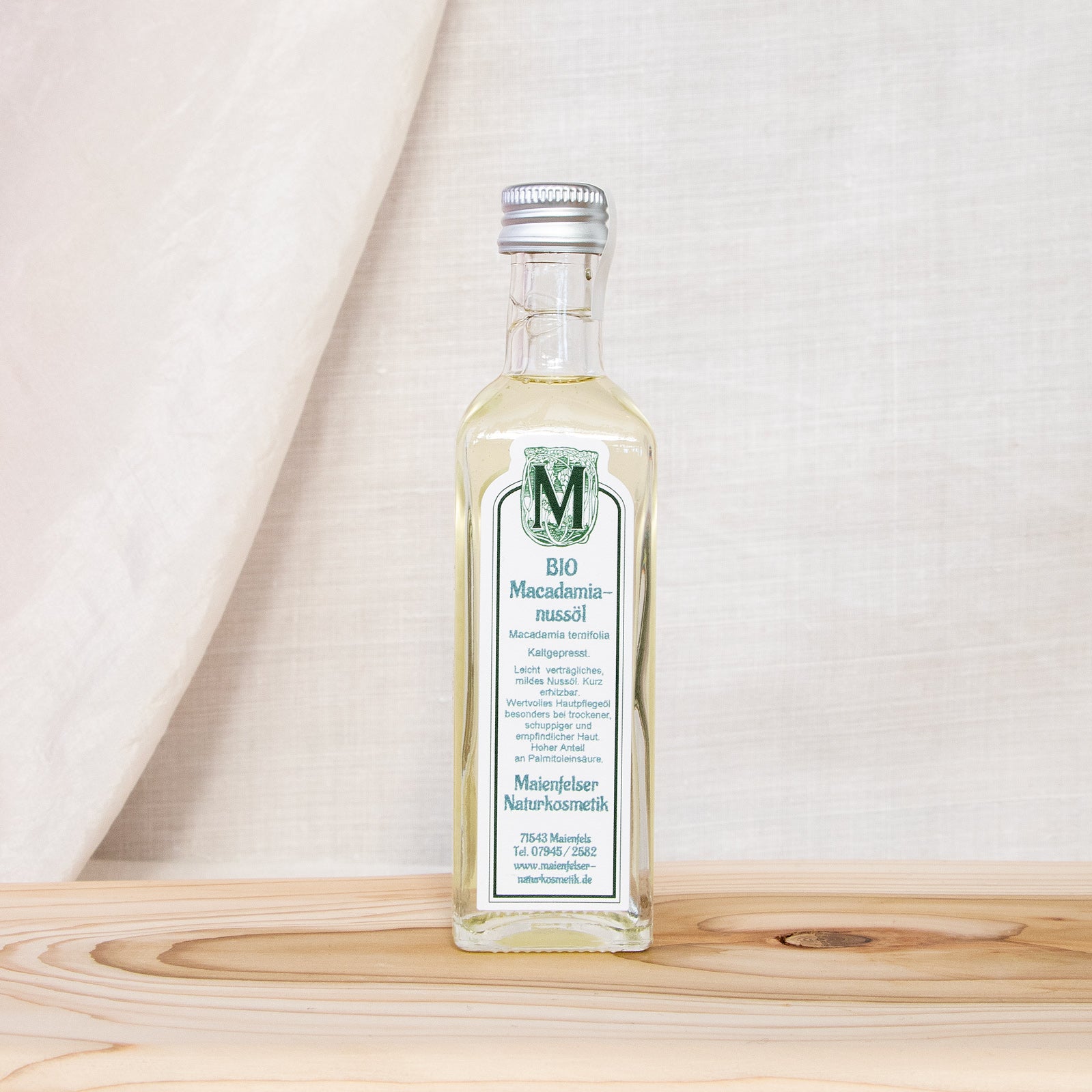 Der Macadamiabaum stammt vormals aus Australien, wird jedoch inzwischen auch in Hawaii, Neuseeland und Südafrika angebaut. Die Früchte, in denen die Nüsse vorhanden sind, haben eine extrem harte Schale, die vor der Pressung geknackt werden muss. Macadamianüsse zählt man zu der 'Königin der Nüsse', was natürlich auch für das daraus gewonnene Öl gilt. Es ist von seiner Ölsäurezusammensetzung her eine Besonderheit durch den enorm hohen Anteil von Palmitoleinsäure, einer ungesättigten Fettsäure, die sonst in nennenswerten Mengen nur in tierischen Fetten vorhanden ist (Nerzöl).