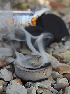 Wichtig! Die Kohletablette ist dann ganz umgeben von einer dünnen Schicht weißer Asche. Dies ist notwendig, denn wenn Sie vorher Räucherwerk drauflegen, erstickt die Kohletablette und Ihre Räucherung ist jäh zu Ende. Falls die Kohletablette vorher ausgeht, hat sie Feuchtigkeit gezogen und Sie müssen den Anzünde-Vorgang wiederholen. Deswegen Kohletabletten unbedingt in einer kleinen Plastiktüte oder einer geschlossenen Schachtel aufbewahren, damit sie im Lauf der Aufbewahrungszeit keine Feuchtigkeit ziehen.
