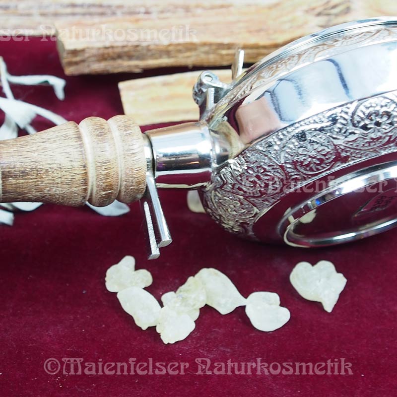 Eignet sich sehr gut zur Hausräucherung, da man die Räucherpfanne einfach am Griff fassen und mit der Räucherung durchs Haus gehen kann. Falls Sie die Räucherpfanne abstellen möchten, bietet sich hier eine schöne, polierte Baumscheibe (mit Jahresringen) aus besonderen heimischen Hölzern an, auf der Sie ohne Gefahr auch eine Standräucherung durchführen lässt. Bitte stellen Sie das heiße Räucherpfännchen immer auf das Holzbrettchen oder auf eine feuerfeste Unterlage.