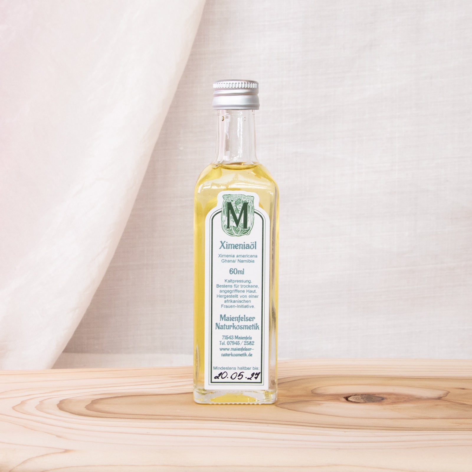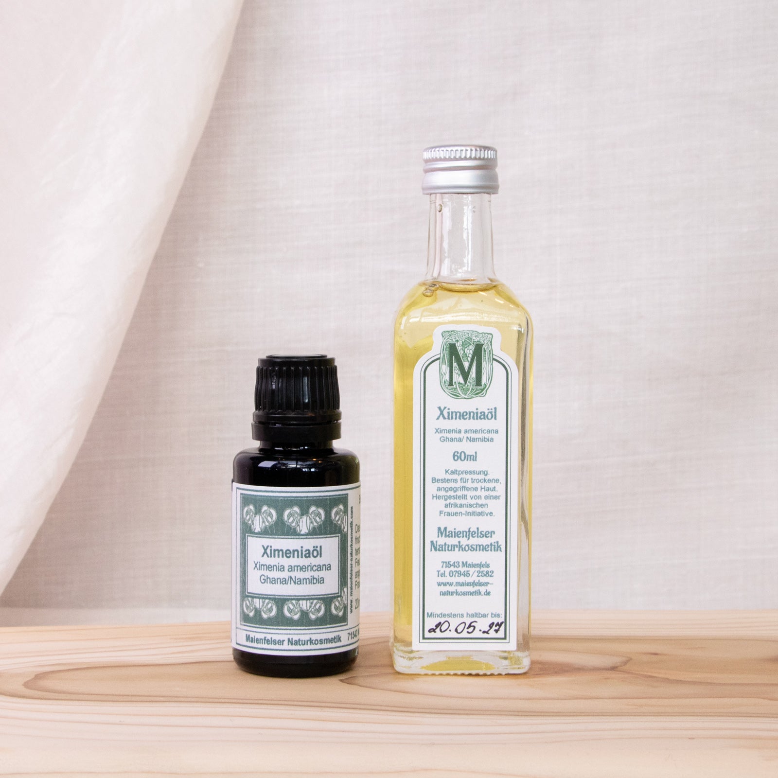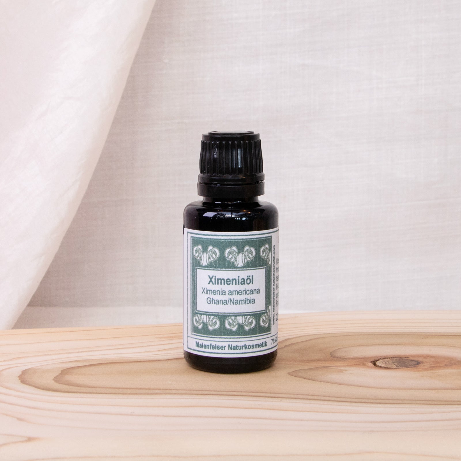 Ein wundersamer Strauch oder kleiner Baum, von dem es sehr viele Arten gibt. Er wächst in tropischen oder subtropischen Gebieten oftmals an Küstenstreifen und an Wasserläufen. Seine essbaren orangenen Früchte, die etwa taubeneigroß sind, enthalten einen muskatnussgroßen Kern, der süß schmeckt und gern gegessen wird. Wie oft in Afrika, kann alles von diesem Strauch/Baum verwertet werden. Das Ximeniaöl hat ein paar Besonderheiten aufzuweisen, wie einen sehr hohen Anteil an ungesättigten Fettsäuren, die sehr selten vorkommen. Gesammelt, geerntet, getrocknet und gepresst von einer Frauen-Initiative zur Unterstützung des ländlichen Gemeinwesens in Namibia.